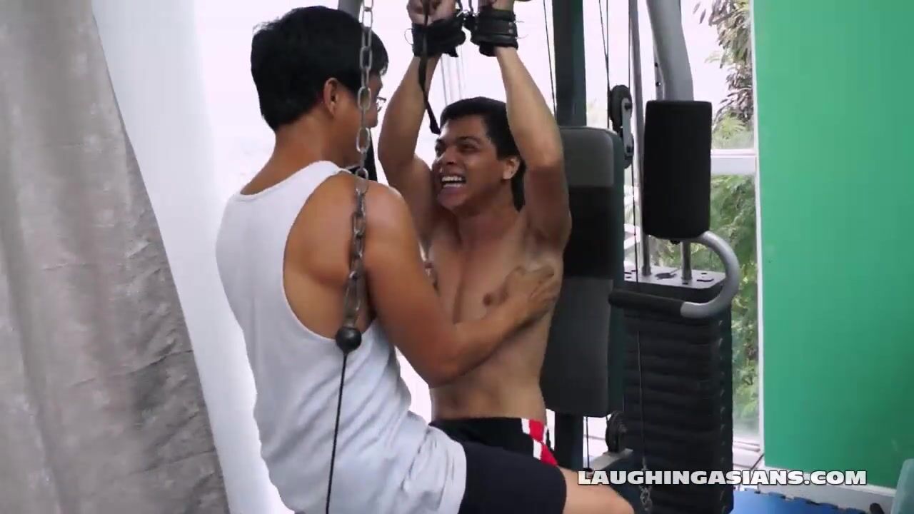 Ricky and Vahn are having a workout on our new gym equipment. Vahn is new to working out, so Ricky is offering some valuable training. But Ricky has an alterior motive. Ricky loves tickling male feet, so he fools Vahn by making up a routine that requires his legs to be restrained to the leg lift. Ricky gets the cling wrap and wraps Vahn's legs around the leg lift good and tight so he can't move. He adjusts the weights so that it's way too heavy for Vahn to push down. Once Vahn says it's too heavy, Ricky says, "I have a way to help you push harder". He begins to unlace Vahn's white Nike sneakers to Vahn's surprise. "Hey why are you taking my shoes off?" asks Vahn. And Ricky pulls off his shoe to reveal his white socks foot, and rakes his fingers up his sole, making Vahn jerk against the restraint. Ricky proceeds to scribble his fingers up and down his socked foot. Vahn giggles and pleads, asking "Is this part of the routine?". Ricky then peels off his white sock slowly while tickling hi