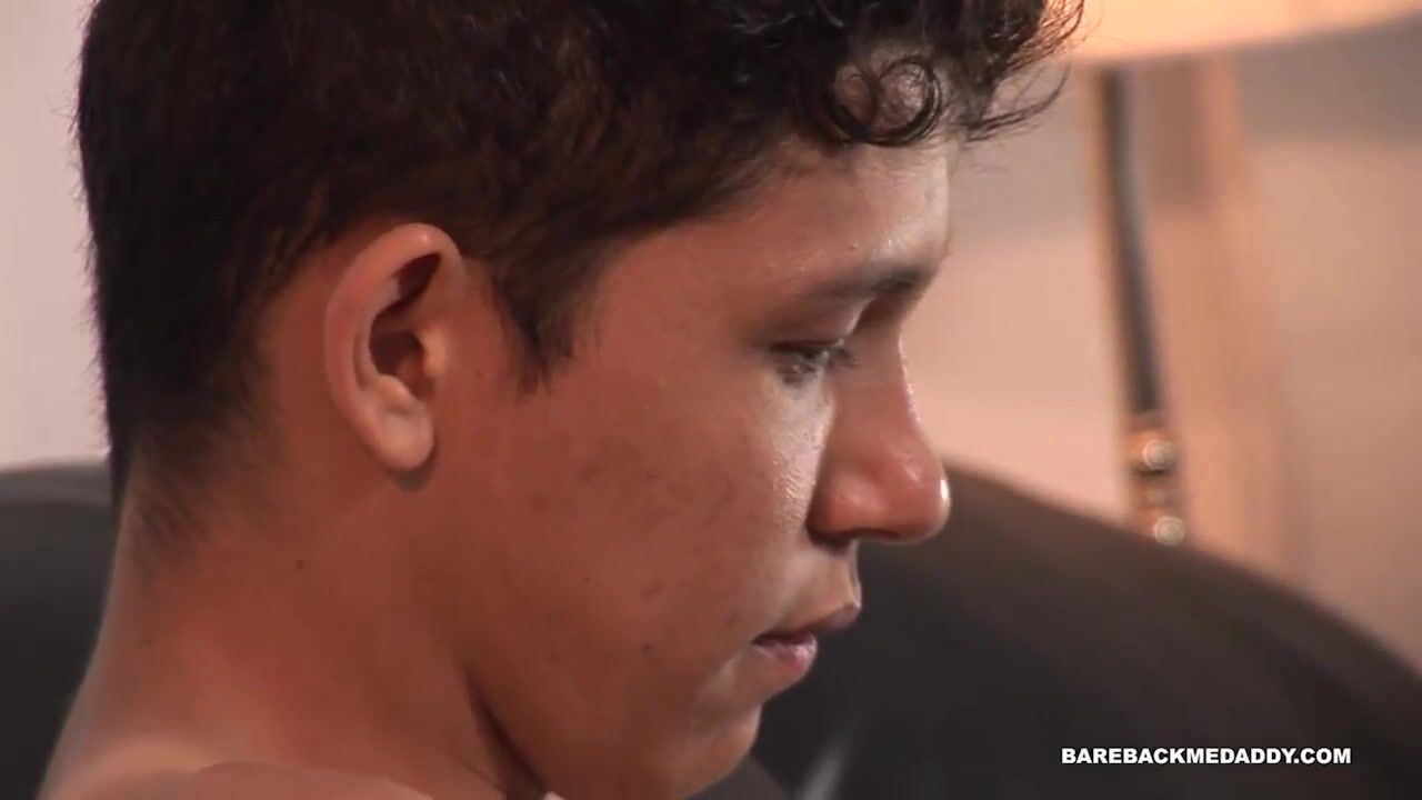 Latin boy Jonas is seated on the sofa and working up a boner, while looking at some porn on his phone. Mature daddy Ferdinan walks in and can't resist the temptation. Soon he's sucking on the boy's big uncut cock and begging Jonas to fuck him in the ass. All boned up, Jonas decides to give the daddy what he wants and slides in from behind. The young man barebacks his older bottom in several positions before finally shooting his load onto that fat ass and breeding him.