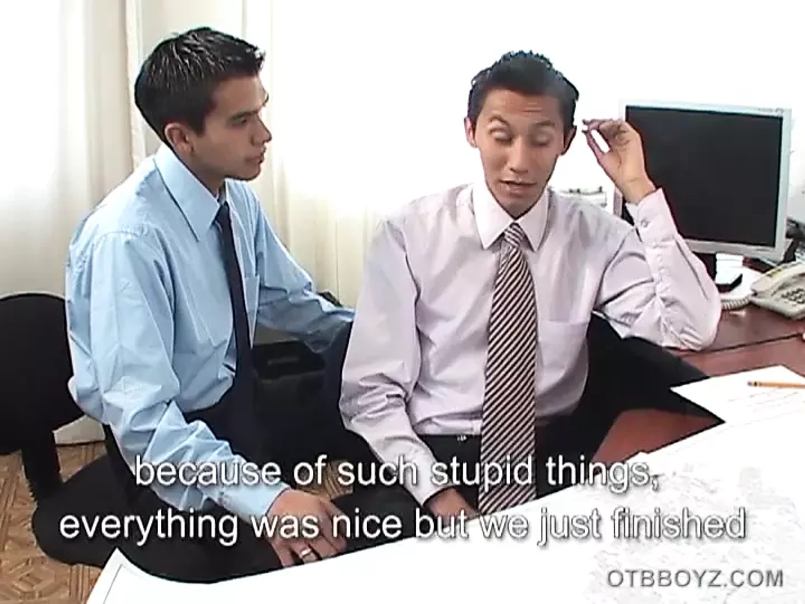We find young Latinos Eduardo and Santiago in an office setting, where a well-placed hand signals the start of their desk top romp. Stripped to their underwear, Santiago goes down on his office mate and a hot oral exchange follows. Then Santiago takes Eduardo from behind and fucks his skinny Latin ass. By the time these horny twinks are done, Eduardo is on his back and wearing both of their cum loads.
