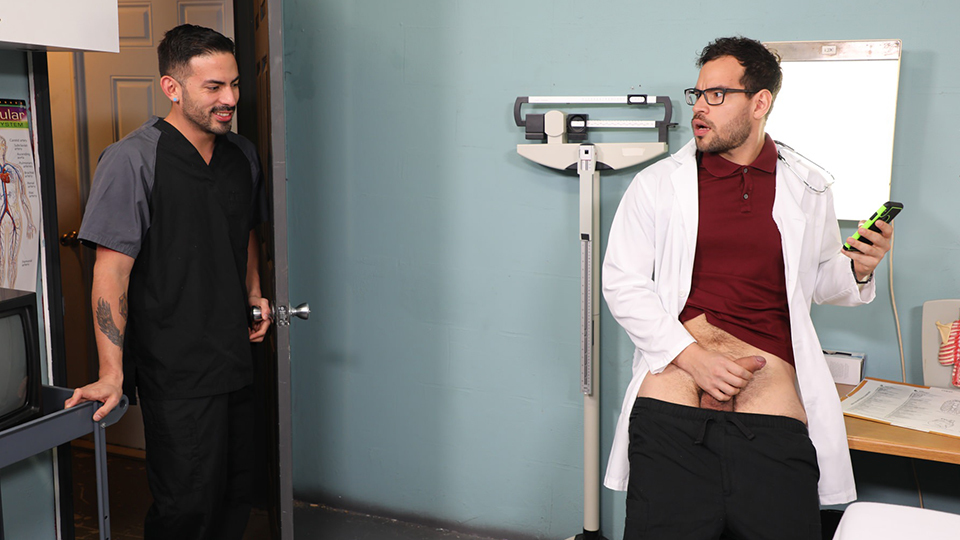 Angel Ventura is alone in an exam room looking at his phone and stroking his cock when the door opens and Cesar Rossi walks in catching him in mid-stroke.