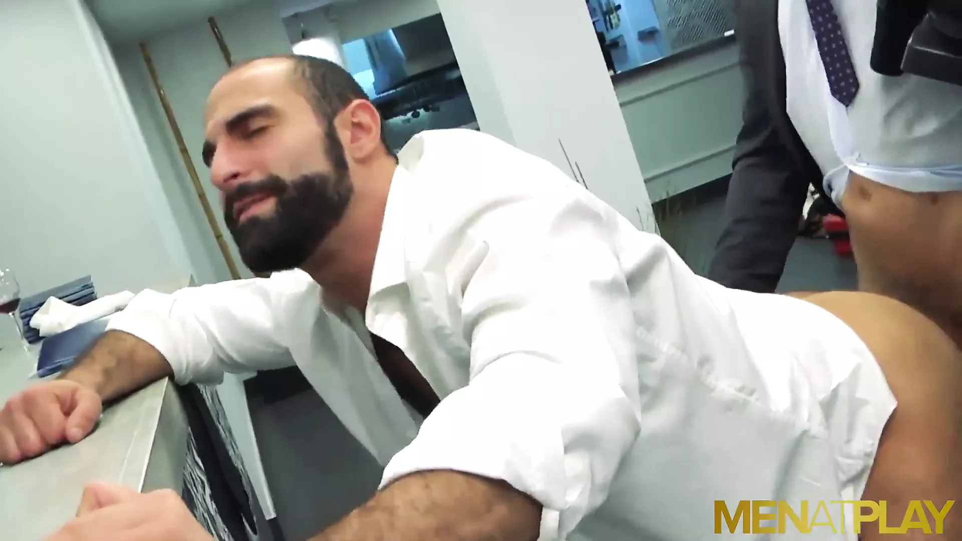 Blond businessman Matthew Anders gave bearded Latino waiter Paco a nice tip and his huge cock as a gift for great service!