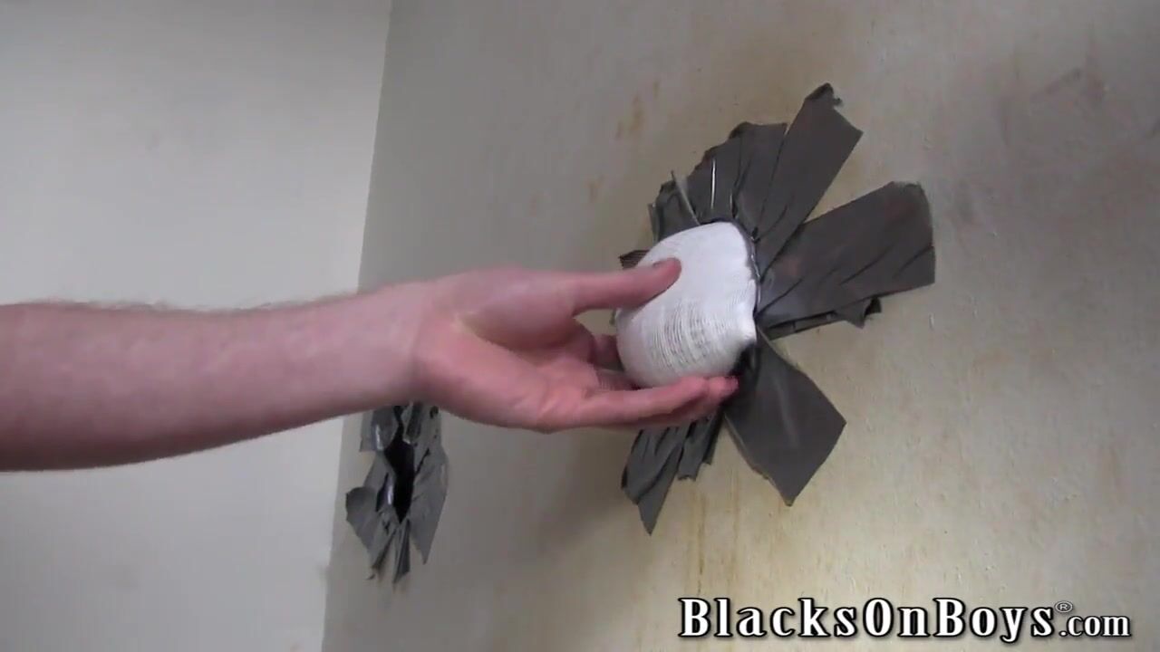 He rents a porn DVD which he starts watching in a viewing booth. He's jerking off and enjoying himself when a black dude sticks his big, black cock through a glory hole.