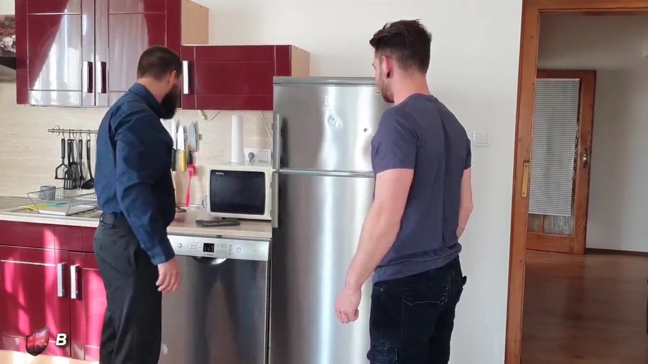 The guilty lad is called in and has to pay the price for his crime. Teodor sets about spanking the lad. Paco takes what's coming as he stands against the fridge, the scene of his misdeed.