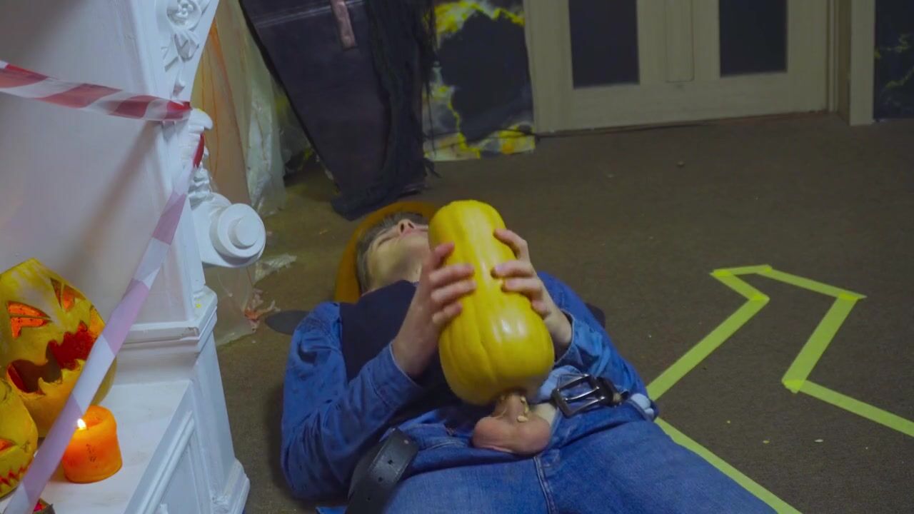 Casey dressed as a pumpkin came to a halloween party and found David handjob with pumpkin