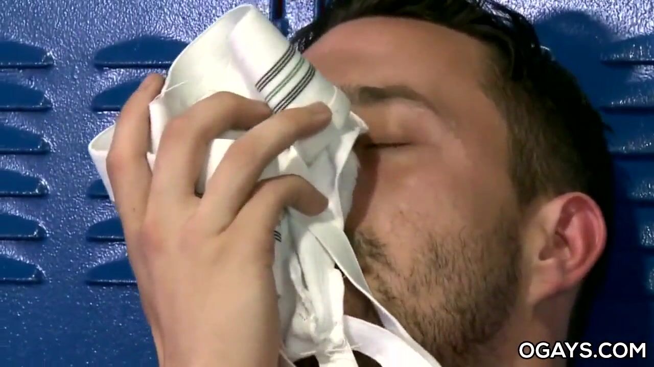 He begins to strip down so he can play with his cock while sniffing and licking the jock-strap.