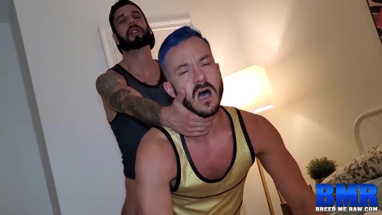 Tattooed blue-haired jock Starlen Gold riding a big wood hard dick and bareback doggystyle ass drilled by inked Romeo Davis after cock sucking!