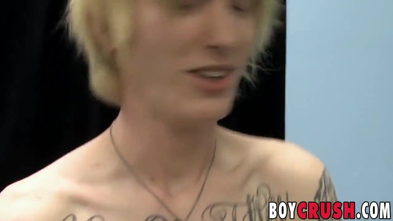 Young blonde man impresses after an interview as he strokes his big dick and cums on his tight body.