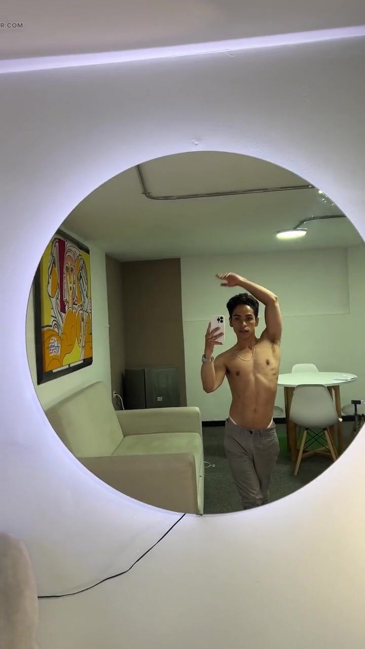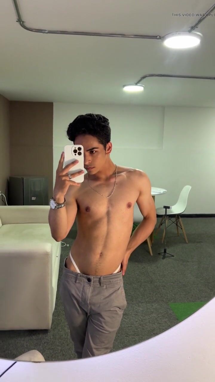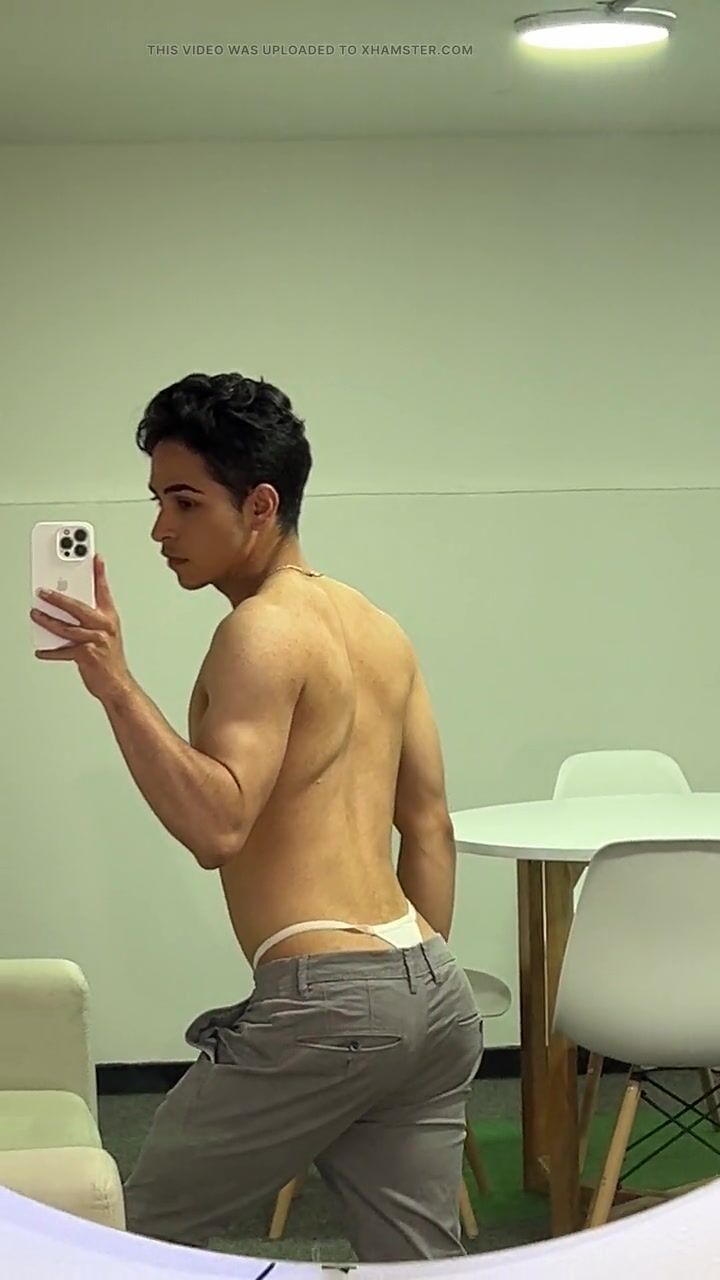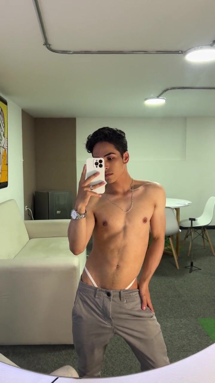 Gay twink models in a thong teasing you with his sensual body. Admire this wonder and how sexy his thong looks with a bit of glamour and elegance.