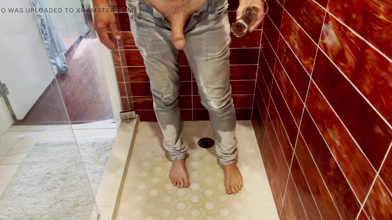 I’m barefoot in jeans and piss in a glass and wet myself by pouring my piss all over me