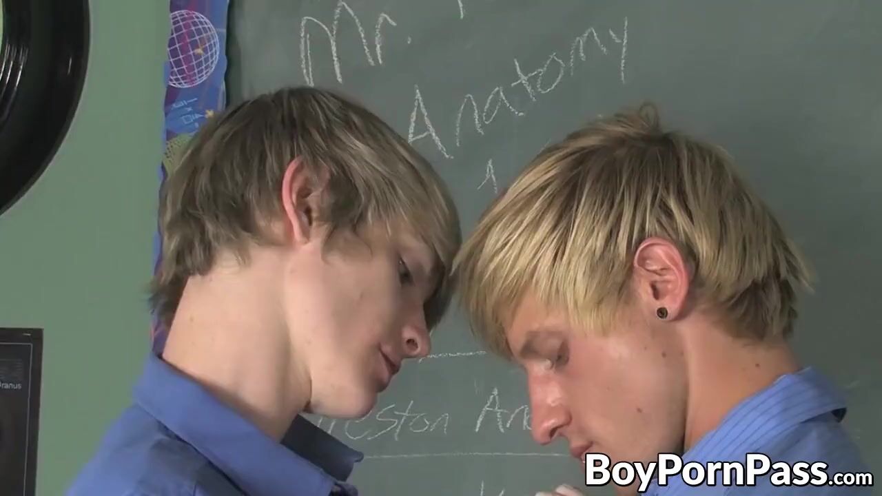 Twink dudes hook up, and then they kiss passionately before eventually fucking in their classroom.