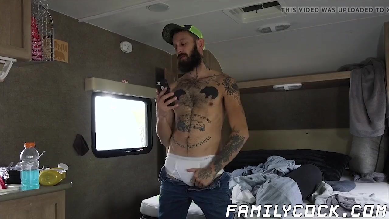 Bearded and tattooed stepdad is going balls deep raw inside his young lover before cumming in his ass.