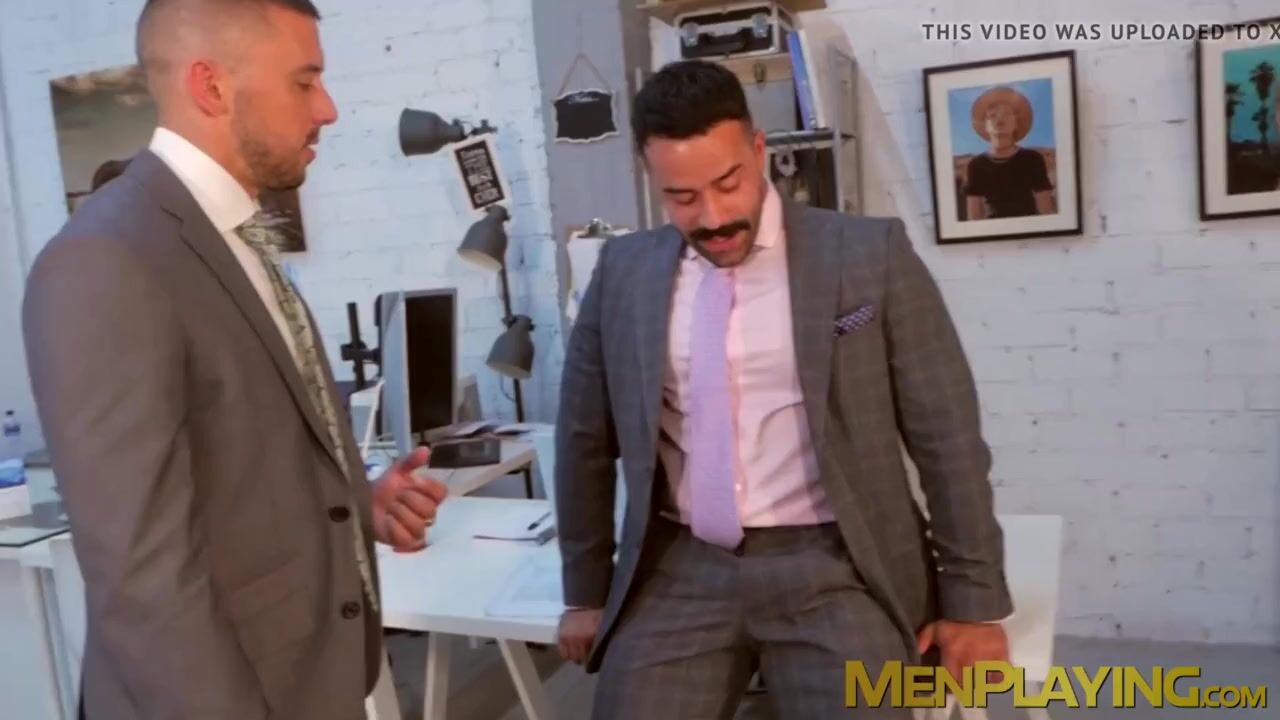 Office worker goes on his knees to give coworker sloppy blowjob before having his tight ass ravaged.