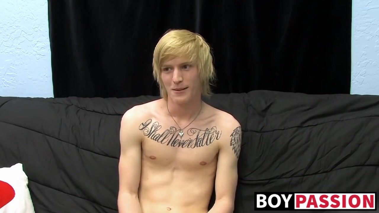 Tattooed skinny Dustin masturbates his rock hard cock after a kinky interview until he sprays warm cum all over the place.