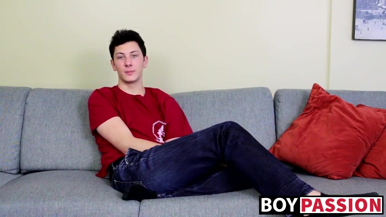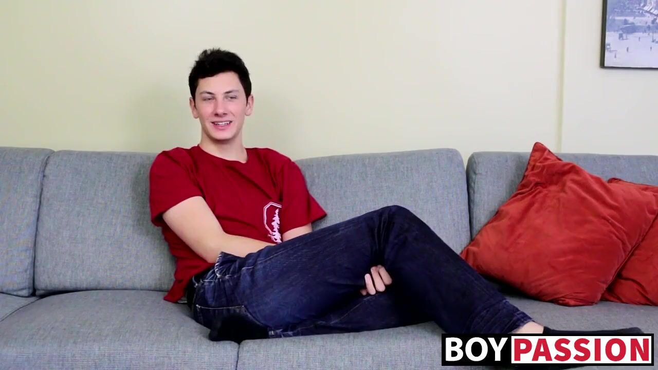 This skinny lad feels a huge need to toy with his thick cock after getting interviewed. He cums all over himself later.