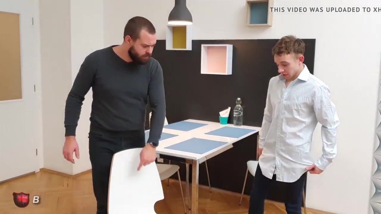 Teodor makes Taavi kneel on the floor bending over a chair and produces the paddle. Great position to keep a lad in place for a spanking.