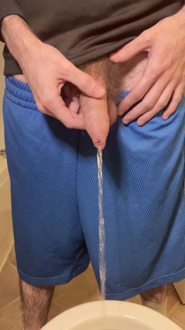 Hairy uncircumcised white guy in gym shorts pissing in the toilet