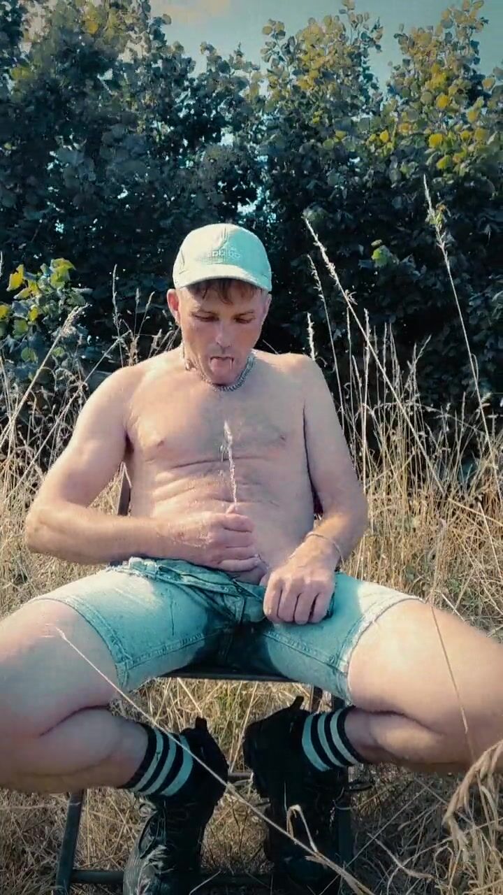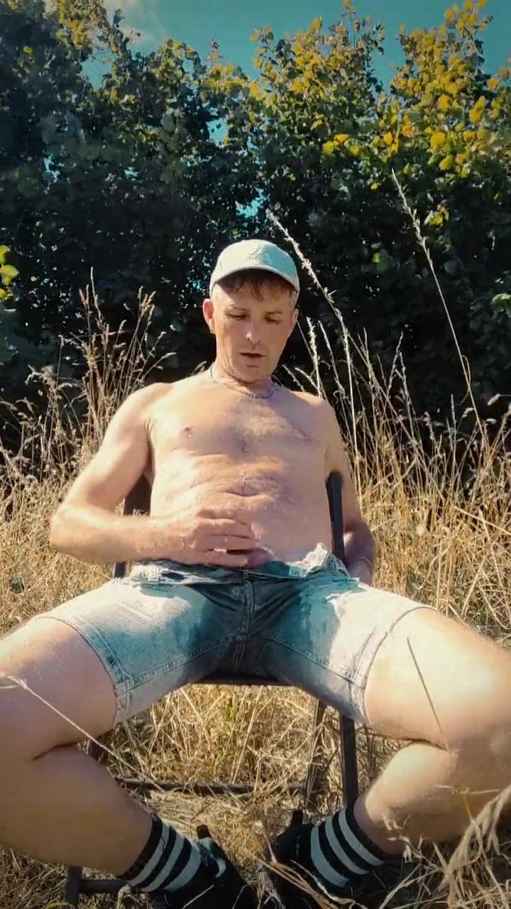 Scallyoscar piss drinking and soaking ripped denim shorts outdoor