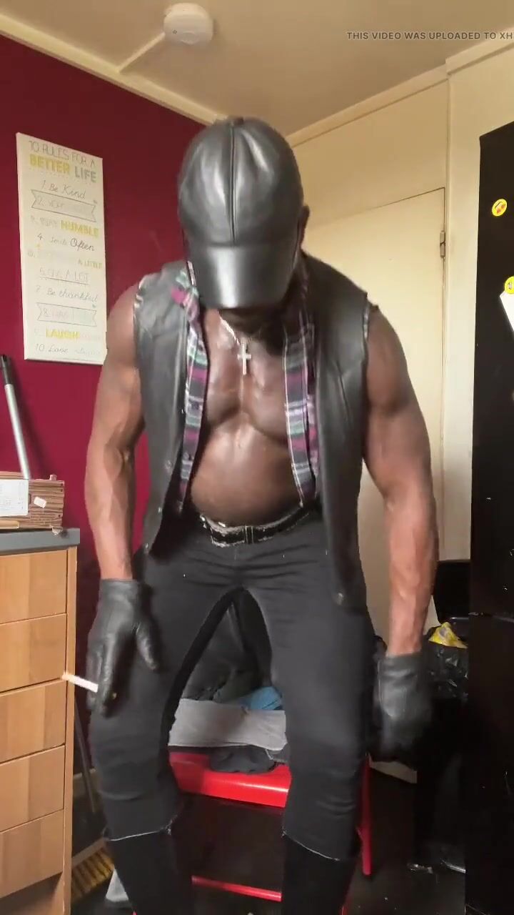 Mature black muscle indulges in smoking session, attired in tight black denim, leather boots and leather waistcoat.