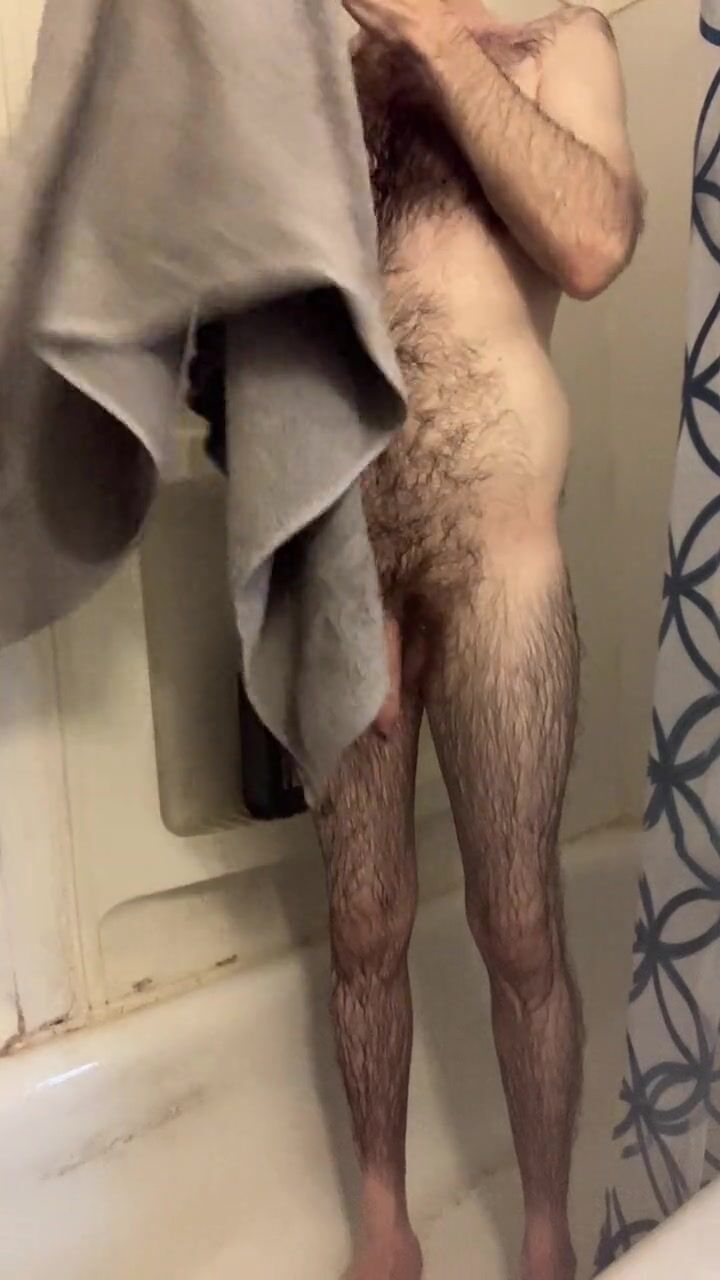 Skinny hairy white dude with a big uncut cock takes a quick shower