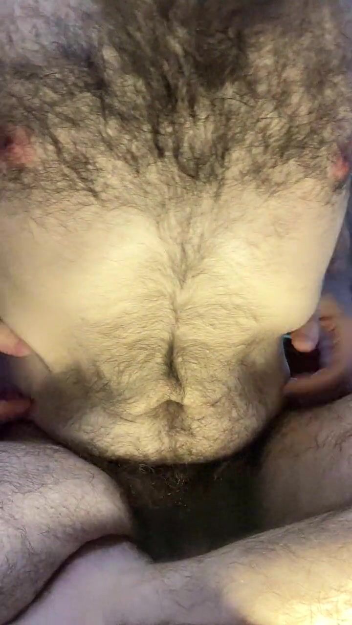 Very hairy bald blue-eyed guy sitting around and swinging flaccid uncut dick and balls