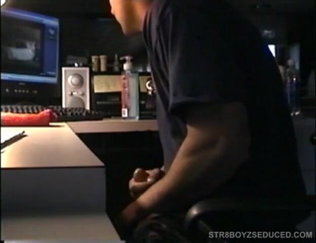 While sitting at the computer, Vinnie's str8 roommate Zack finds the porn movie and gets right into stroking his lubed up cock. He wants to finish off quickly, but Vinnie tells him to hold off for a bit. When he's ready to pop, Zack stands and pumps his load into his underwear. Zack lets Vinnie lick his head a little, before getting dressed.