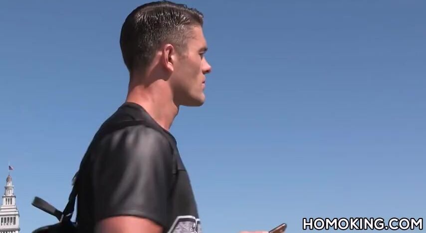 Hot guy picking up and blowing off a muscular man on the bea