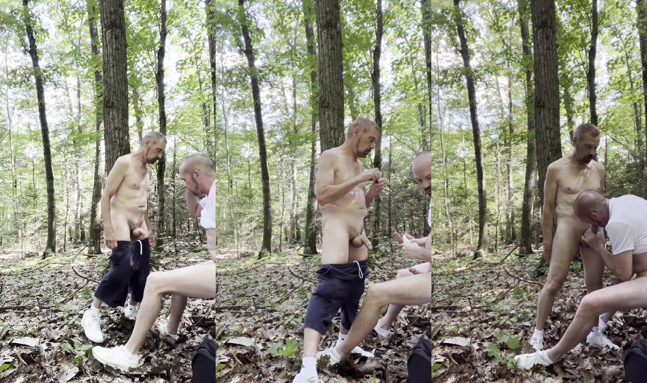 Daddy swallows his buddy’s piss. We work on our cocks in the woods and I get my buddy to shoot a load on my cock.