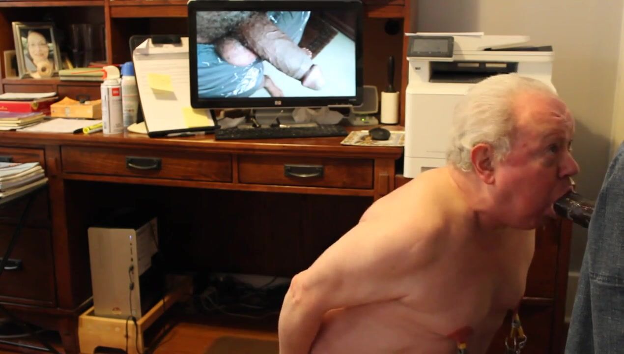 Erachi is cuffed and his nipples are clamped and weighted as he services his black daddy's cock! He sucks out a big mouthful of his cum and then gets a good ass-fucking!