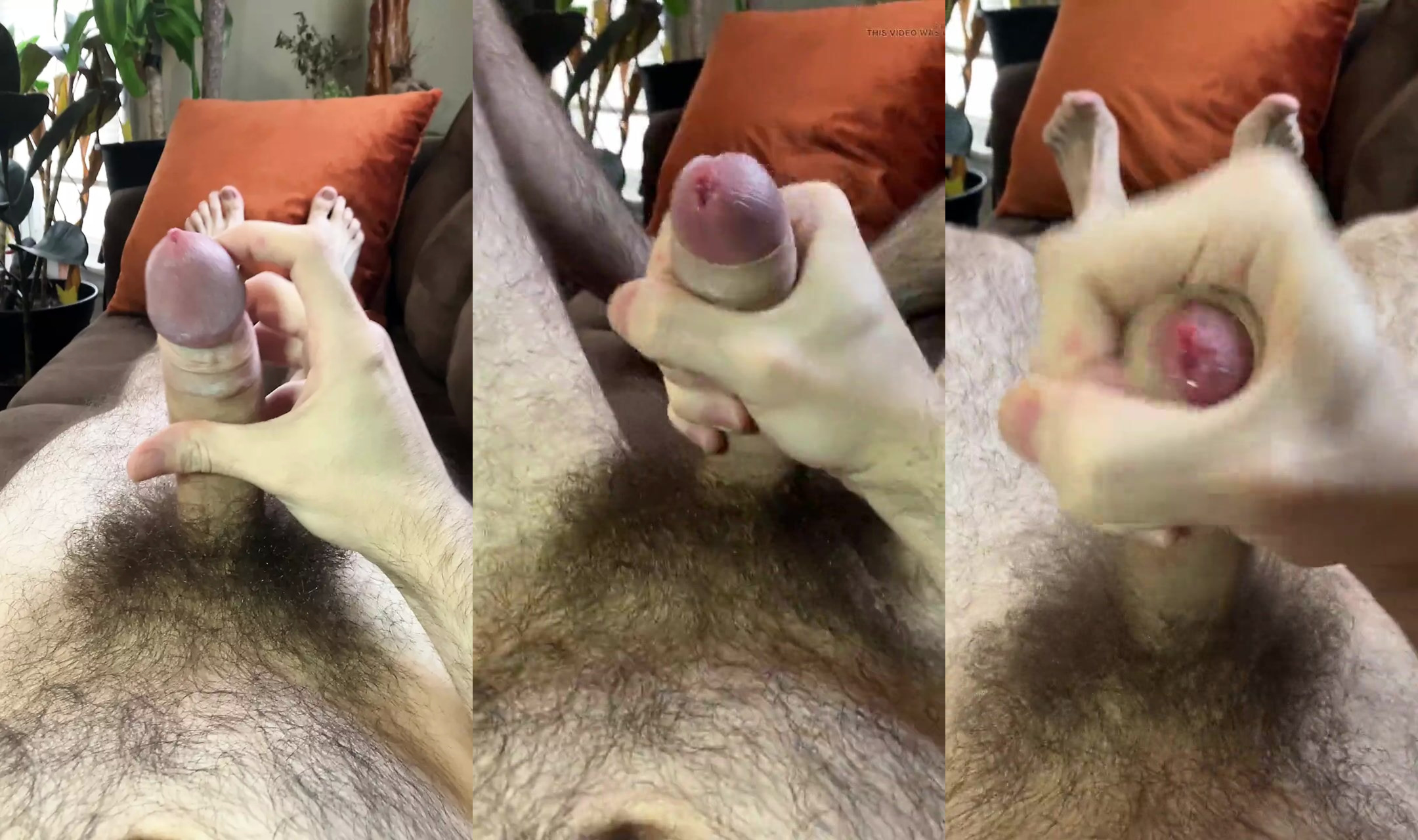 Pretty good jerk session after I took a break for a few days. Not the most flattering look at my dick but it was a very satisfying cumshot. This time you get my hairy feet and legs in the background.