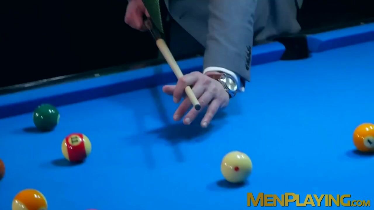 Naughty classy bearded hunk David Cork cock sucked by handsome man in suit Lukas Daken while playing billiard before hard banging.