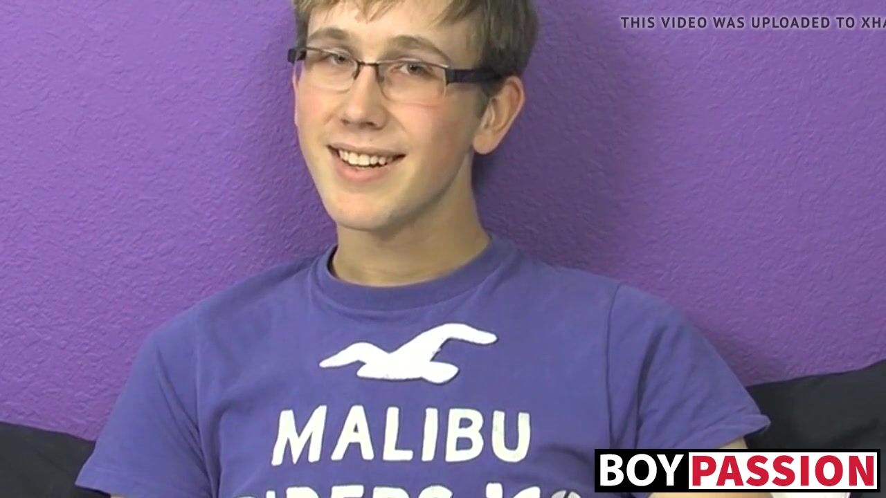 Nerdy skinny twink Tommie Reed jerking off his big cock solo after interview.