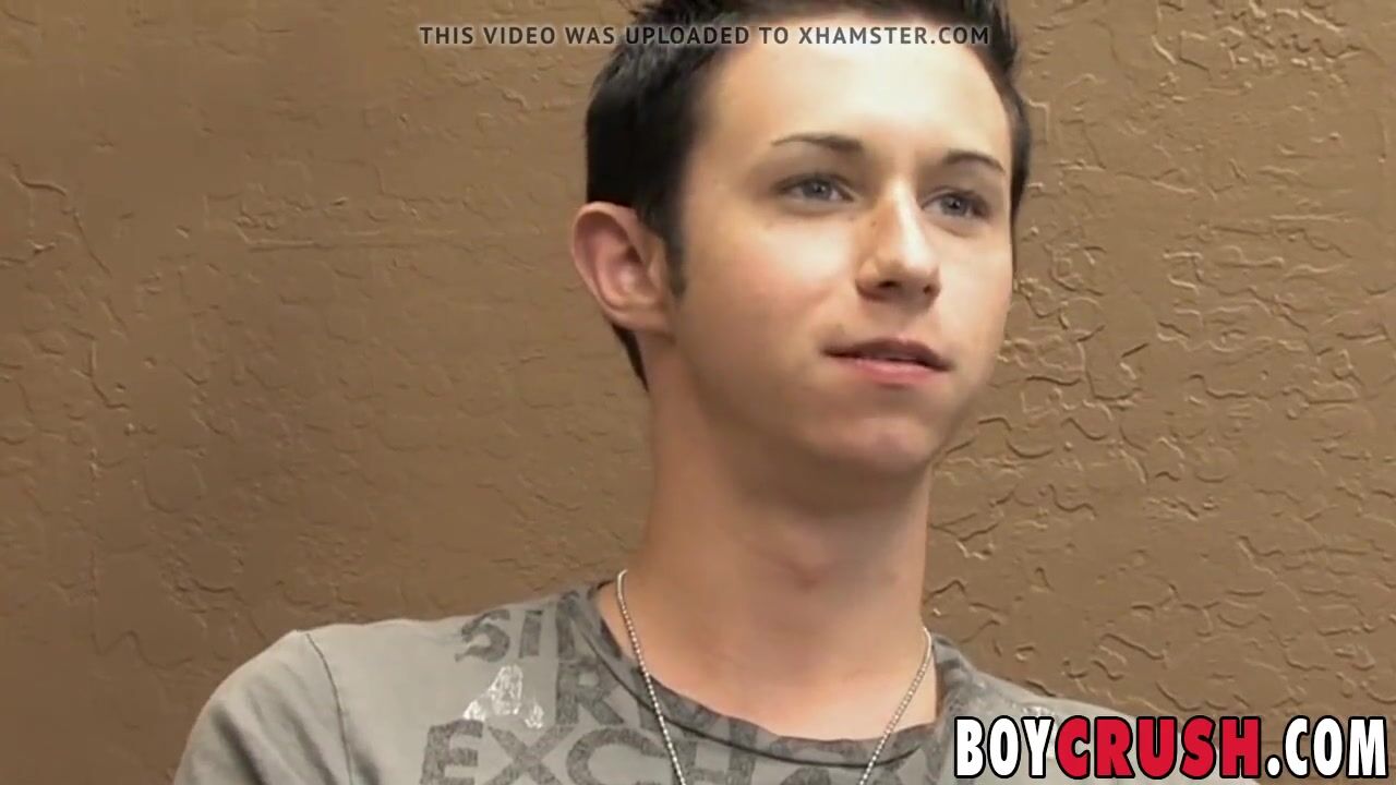 Skinny twink Mickey Drake wears leather underwear for interview before taking it off and wanking his big throbbing cock.