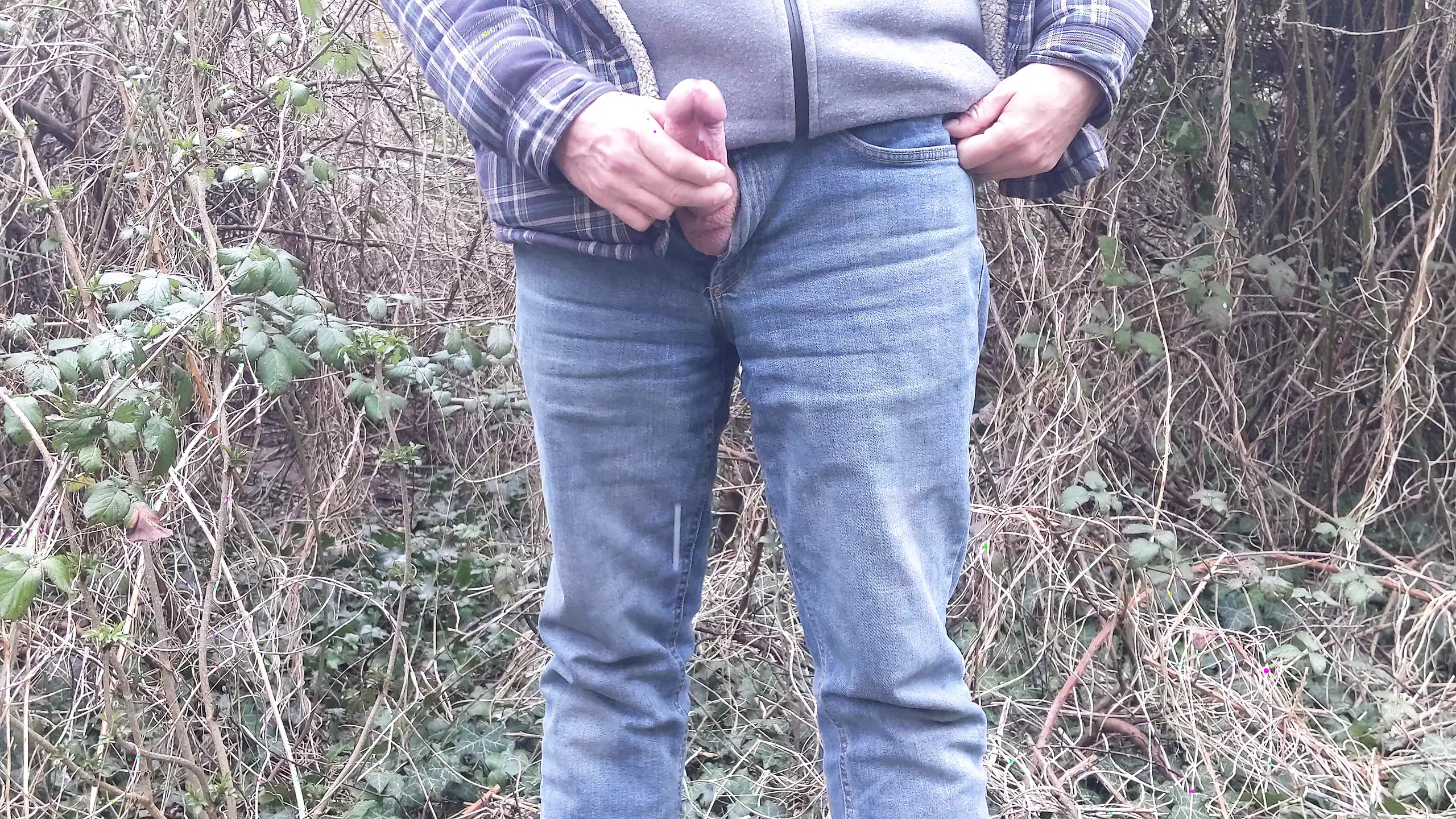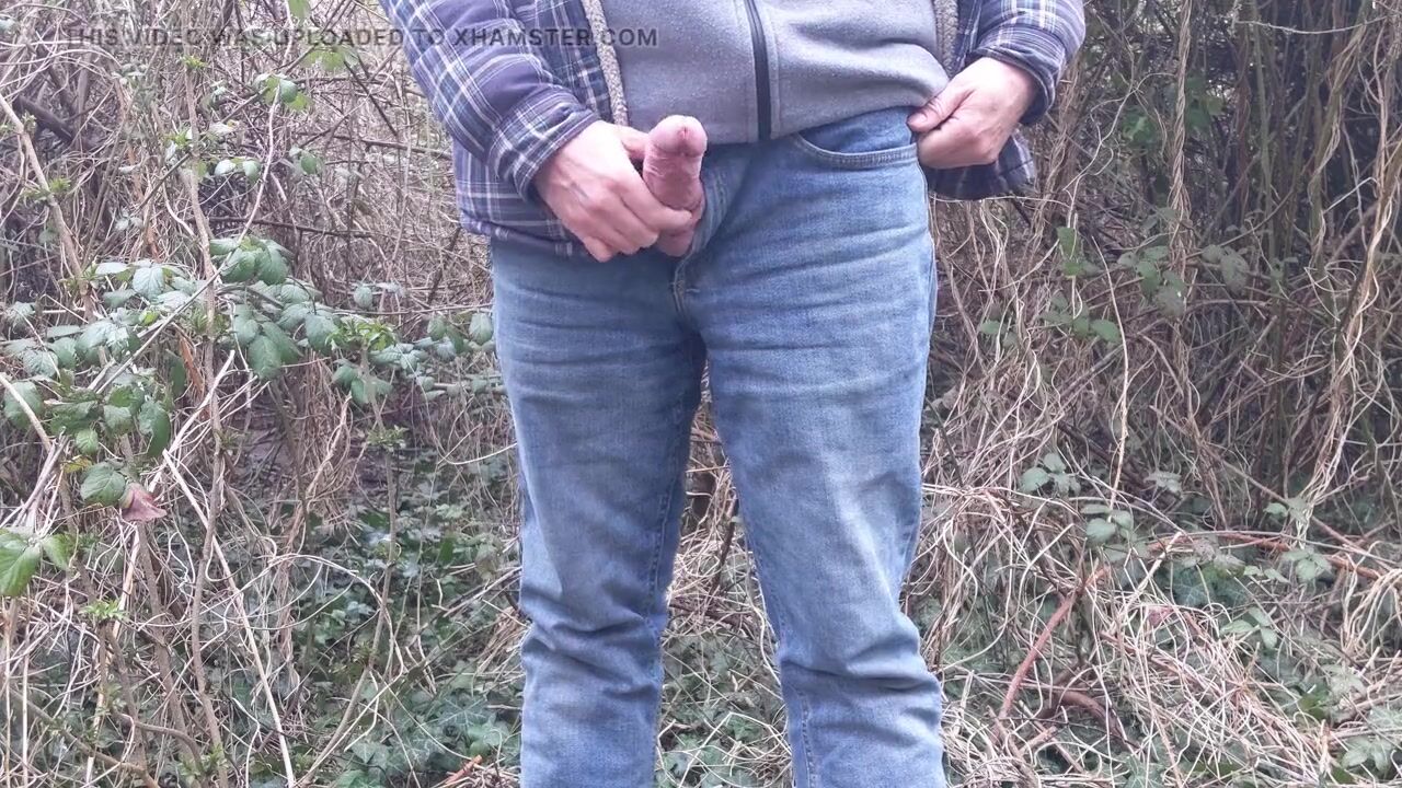 Public cruising in the woods, wearing jeans with my cock out. Wanking and cumming as a masturbating stranger watches.