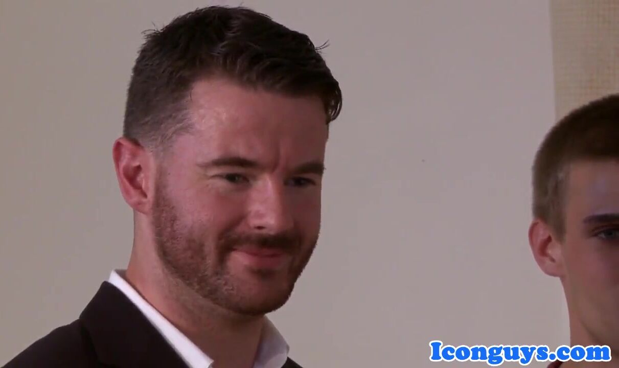 Mature priest cocksucking in trio before jerking and cumming on younger studs