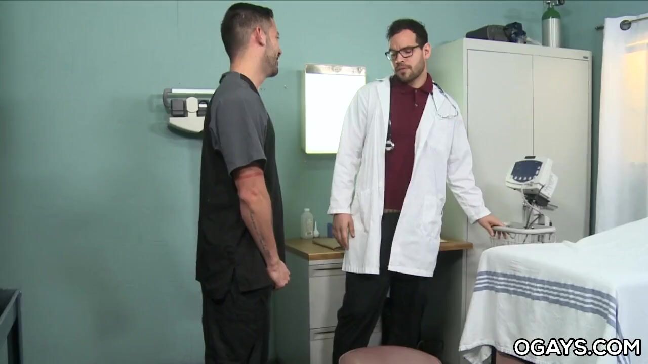 Angel Ventura is alone in an exam room looking at his phone and stroking his cock when the door opens and Cesar Rossi walks in catching him in mid-stroke.