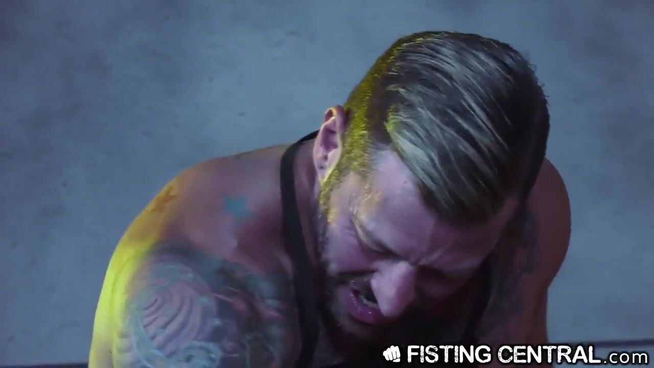 Hugh Hunter known as Dr. FrankenFuck fists his creation, Teddy Bryce. He is inked up, younger &ready for his treatment. He's upside down on a chair, legs spread & ready for daddy Dr.FrankenFuck's fist