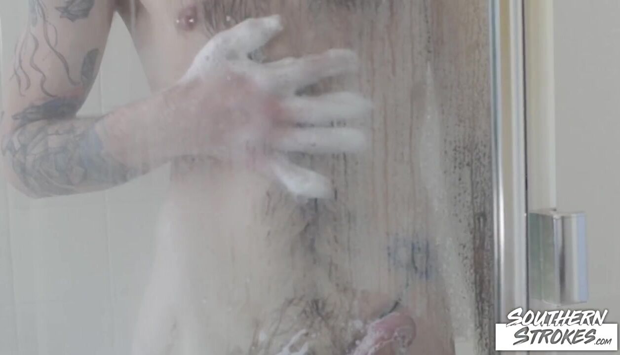 Tattooed blond amateur Declan Moore takes a sensual shower and lubes up his cock for a good rub, while watching porn on his mobile phone!