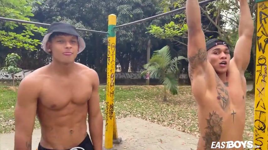 Latino guys show their muscles during exercise and then oil and massage their abs