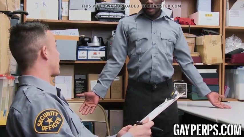 Poor performing ebony security officer gives his colleague a sloppy blowjob before being barebacked.