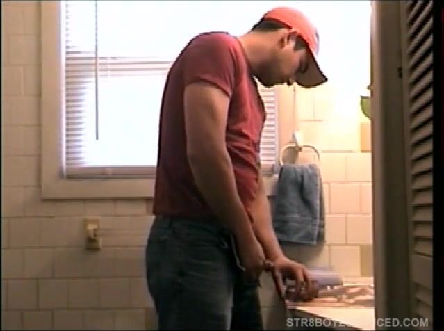 Zacks stops in after work to pick up some clean clothes and when he sees the new Playboy magazine he heads to the bathroom, pulls down his pants and starts stroking himself. I get a chance to film his beautiful bubble butt this time around as he stands in front of the mirror. I leave the camera and stand in front of Zack, as he jerks his cock, and soon he groans and shoots a stream over my shoulder and onto my lips.