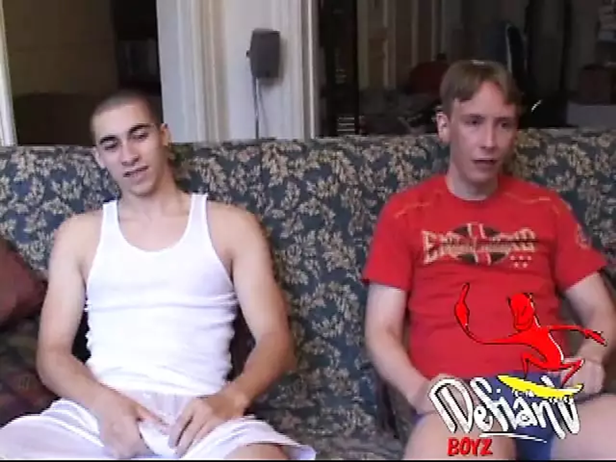 Levi throws in a porn video and the boys settle into the couch and go to work on their cocks. They stroke solo for a while, until Liam gets brave and leans over onto Levi's formidable dick. He flicks the tip with his tongue, much to Levi's approval. Levi takes Liam's cock to his lips, and then shoves that rod back to his tonsils. The blow jobs have gotten both boy really excited and Levi pumps his load on Liam's chest.