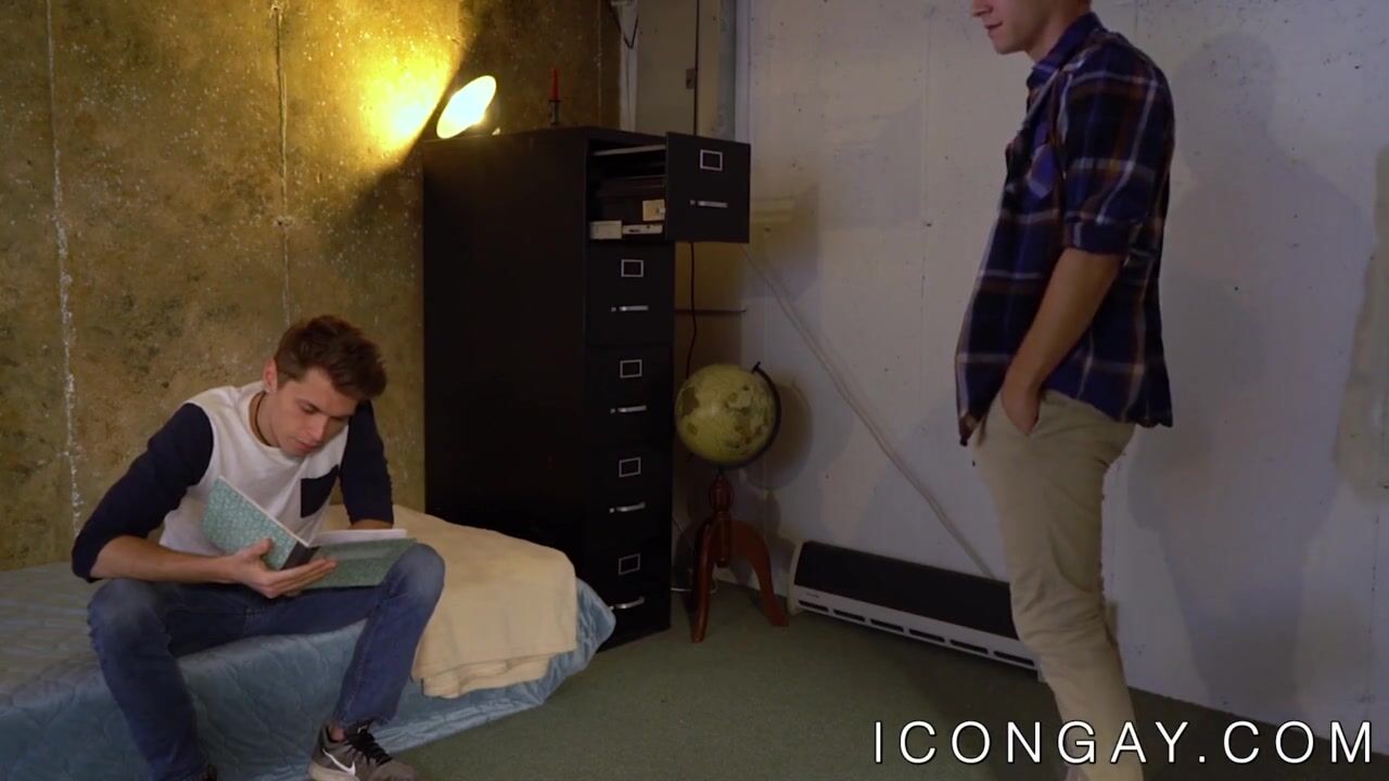 As this young homo is finally out in the open, his friend wants to help him break the barrier and starts kissing him and grabbing his bulge!