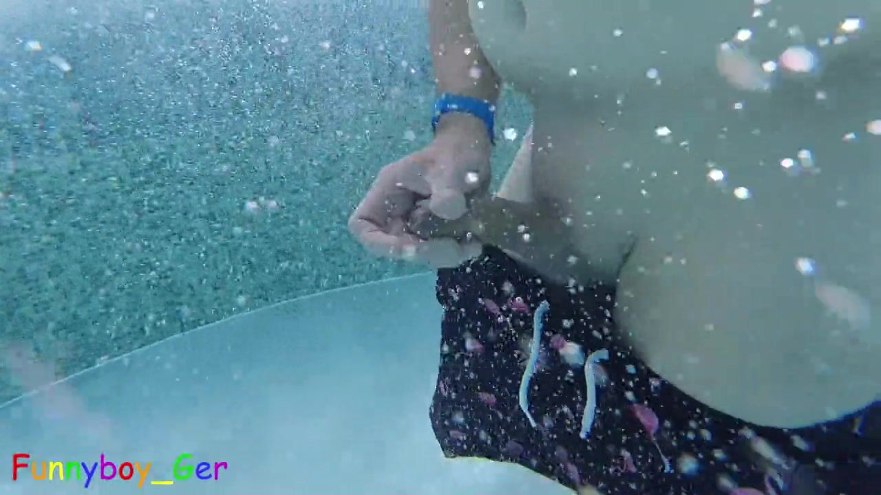 Gay guy cheekily jerks off his fat cock in a public thermal pool. Hot underwater fun.