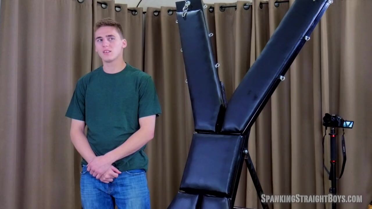 Jordan, a masculine 19-year-old straight boy, is strapped to a bondage cross for a long spanking, paddling and caning.