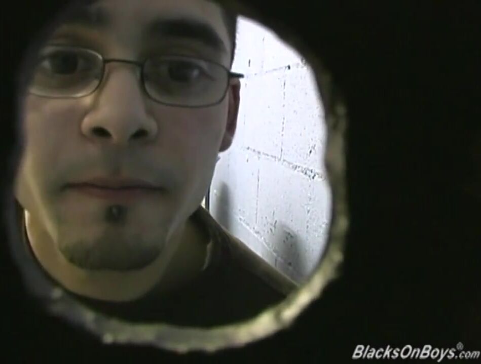 Thin gay white guy sucking off two big black cocks at a gloryhole