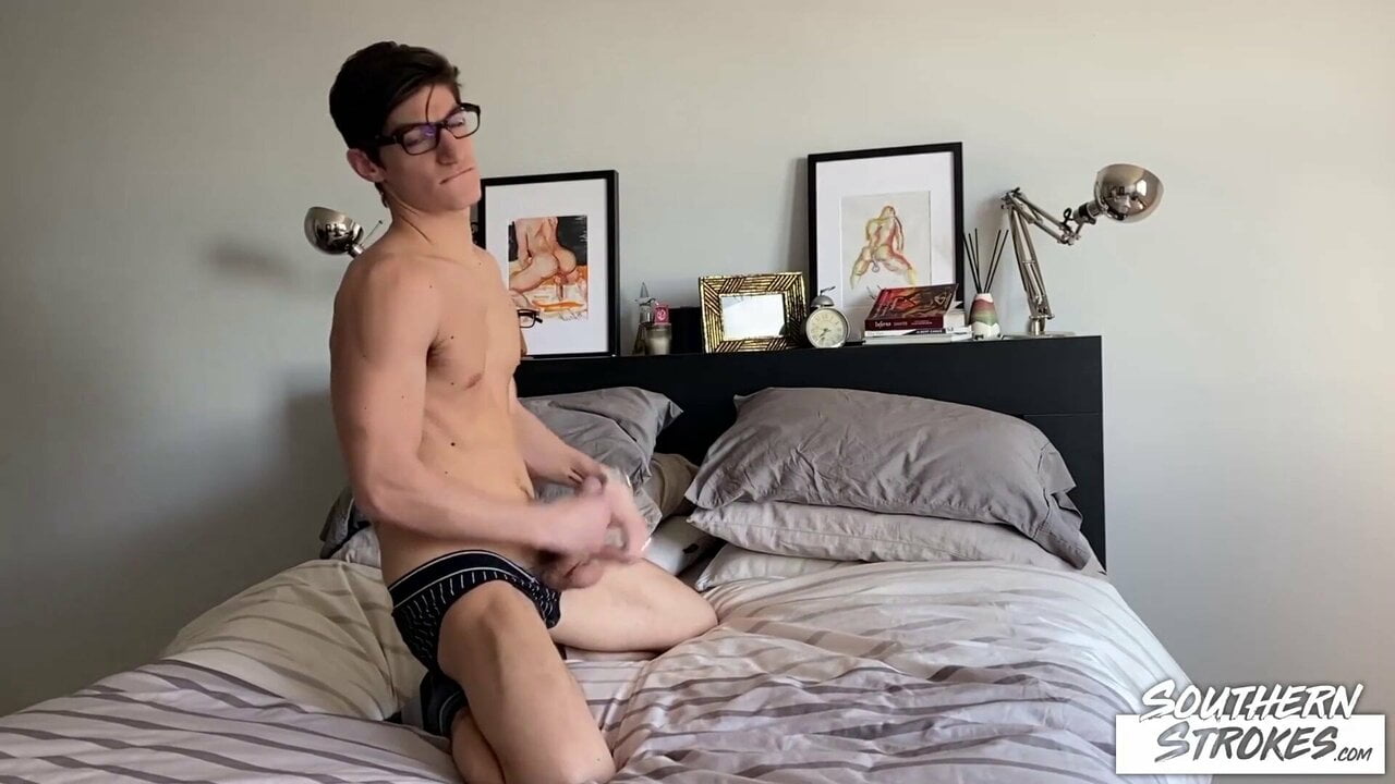 Cute athletic twink Aiden Ward slowly strips naked and starts to play with his big dick, making it harder and bigger while jerking off!
