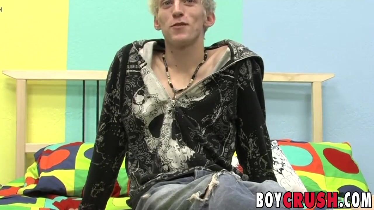 Handsome twink strips naked after being interviewed and makes his dick rock hard to jerk off solo.