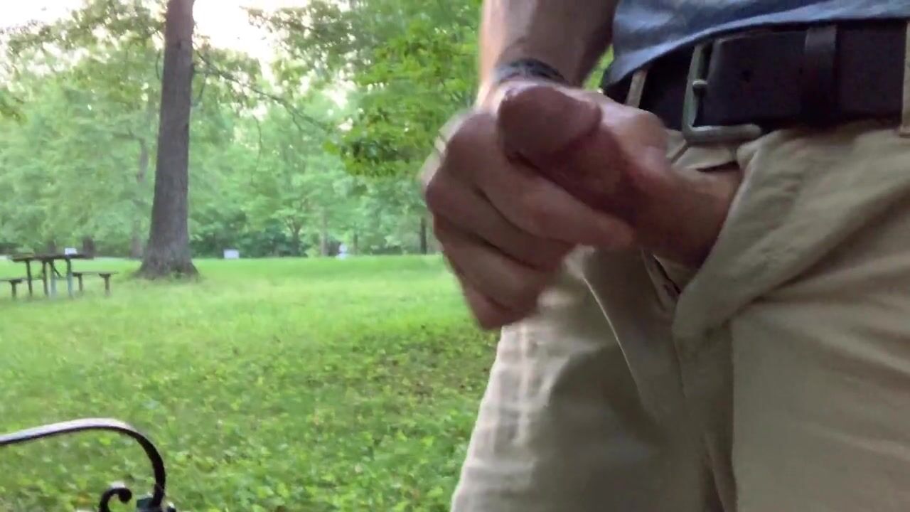 I'm beating-off again on my favorite bench. I was stroking my hard, wet, throbbing cock pretty good for a bit before i started recording. My dick is so hard, I let go a really nice orgasm.