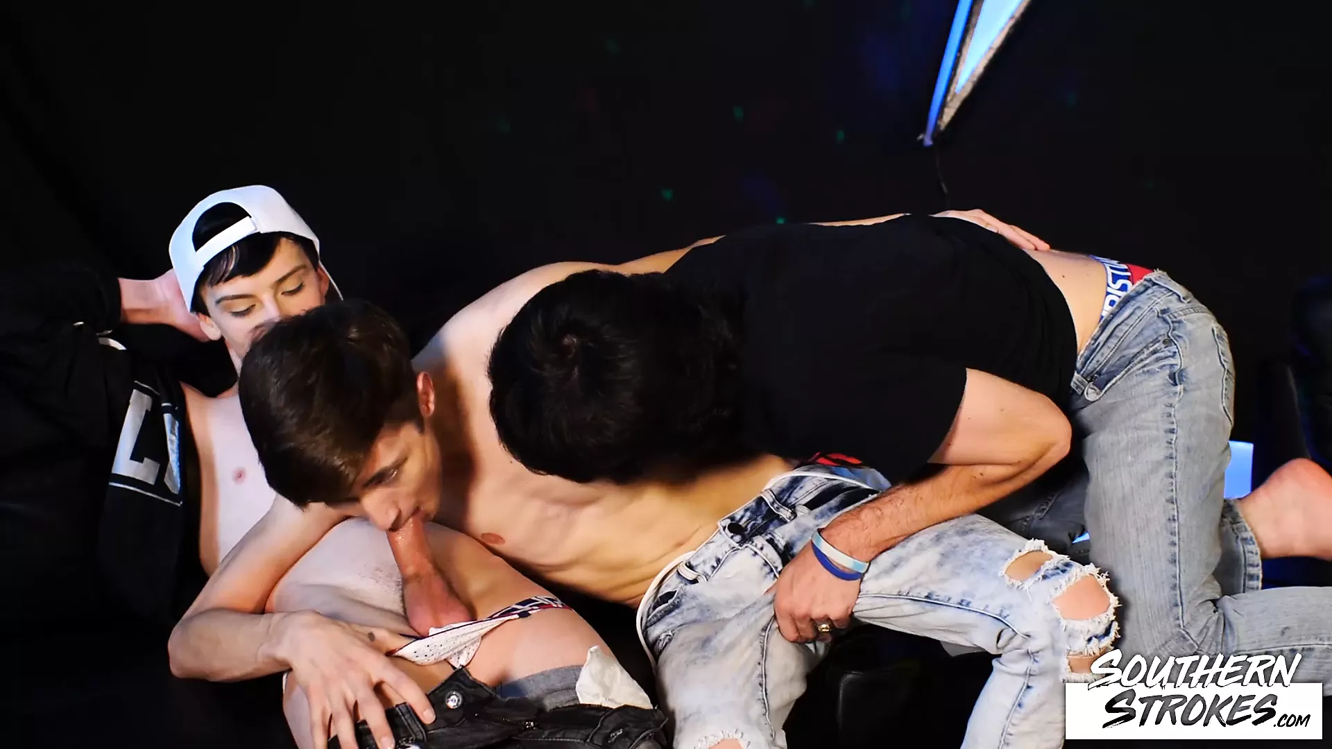 Vigorous young twinks Adam Strong, Chris Summers and Zack Love are sucking dicks in threesome before having a bareback session!