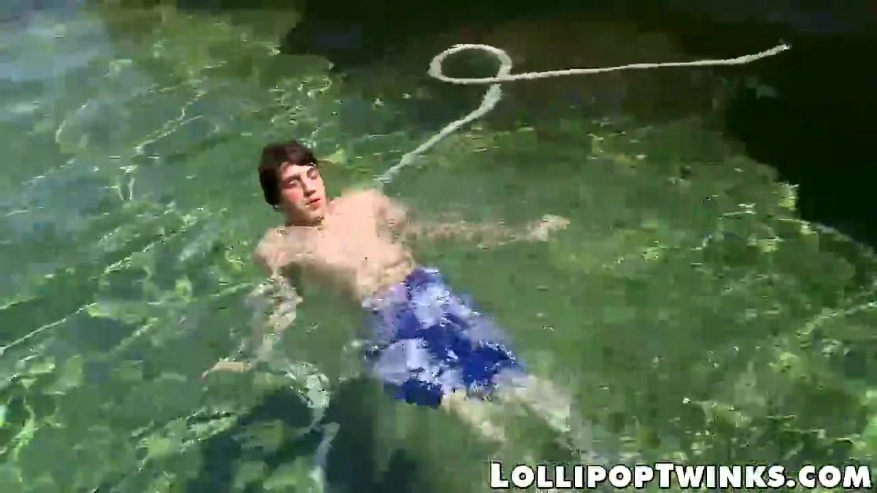 After a dip in the pool the horny boy jerks on his big cock, sliding his fist up and down his shiny and slick shaft.